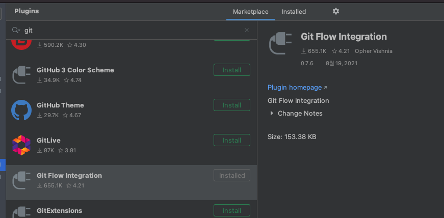 git flow가 설치가 완료되었으면 IntelliJ에서 Git Flow Integration 플러그인을 설치합니다.