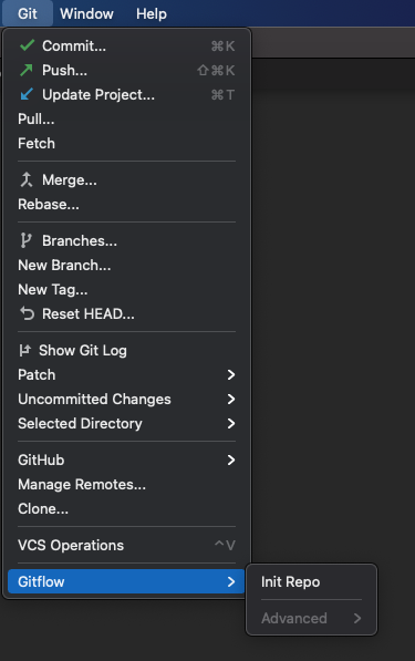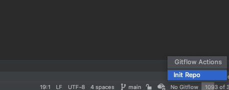 git 메뉴의 Gitflow 또는 오른쪽 하단에 No Gitflow로 Init Repo로 클릭합니다.