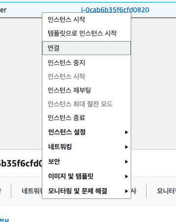 인스턴스를 클릭하고 오른쪽 마우스를 눌러 연결 버튼을 클릭합니다.