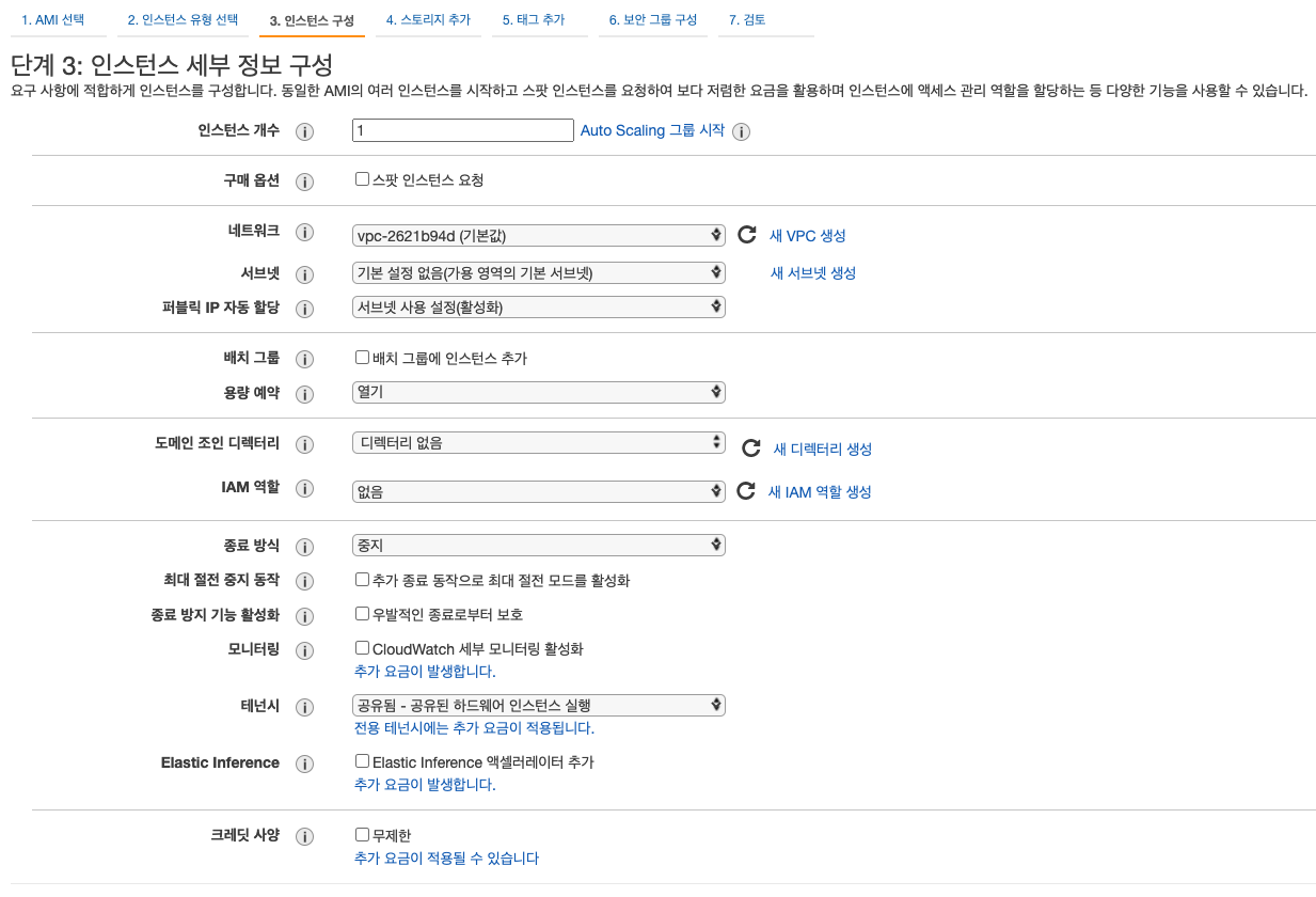 인스턴스의 세부 구성이며 기본값으로 설정해도 됩니다.