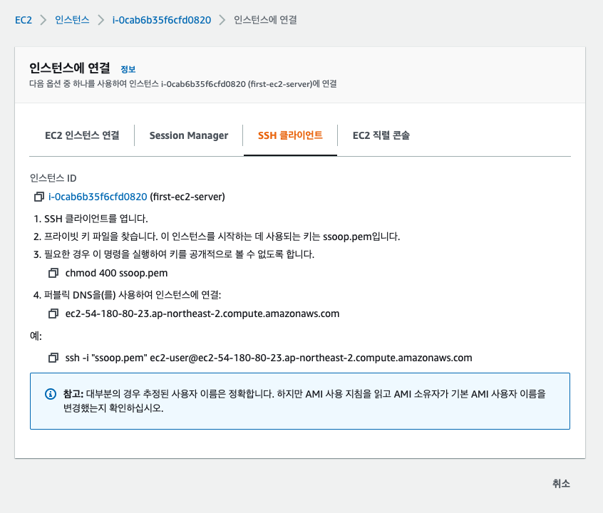 - chmod 400 키 페어 이름.pem 명령어 입력합니다. (읽기 권한 설정)