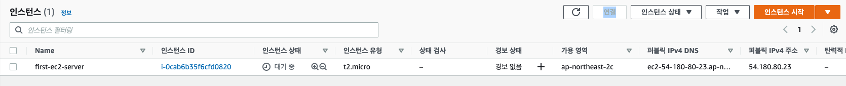 다음과 같이 인스턴스 상태가 대기중에서 실행 중으로 상태 검사가 초기화에서 2/2 검사 통과가 되면 성공적으로 인스턴스를 생성된 것입니다.