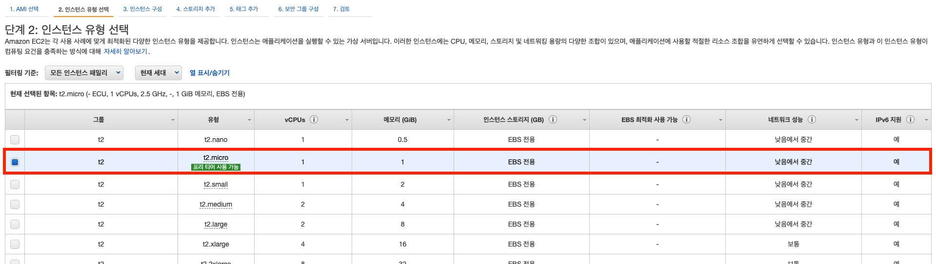 인스턴스 유형에서는 원하는 서버 사양을 선택하여 진행할 수 있습니다.