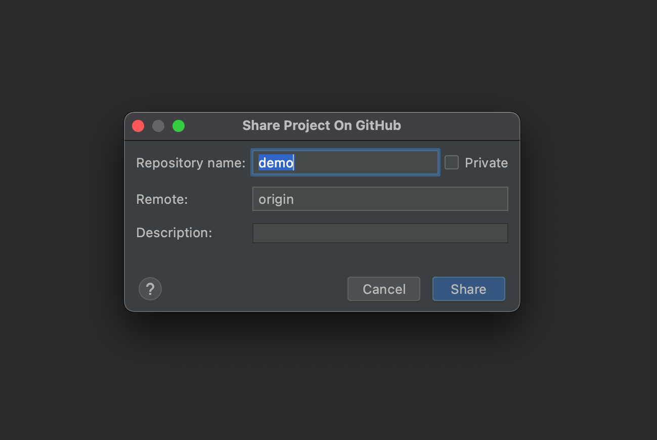 GitHub에 만들 Repository name을 입력하고 Share 버튼을 클릭합니다.