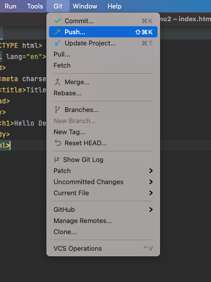 다시 상단바에 있는 Git를 누르고 Push를 클릭합니다.